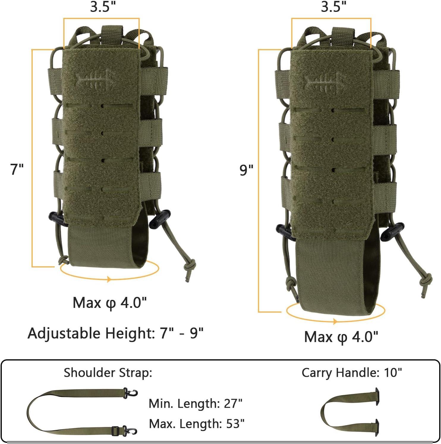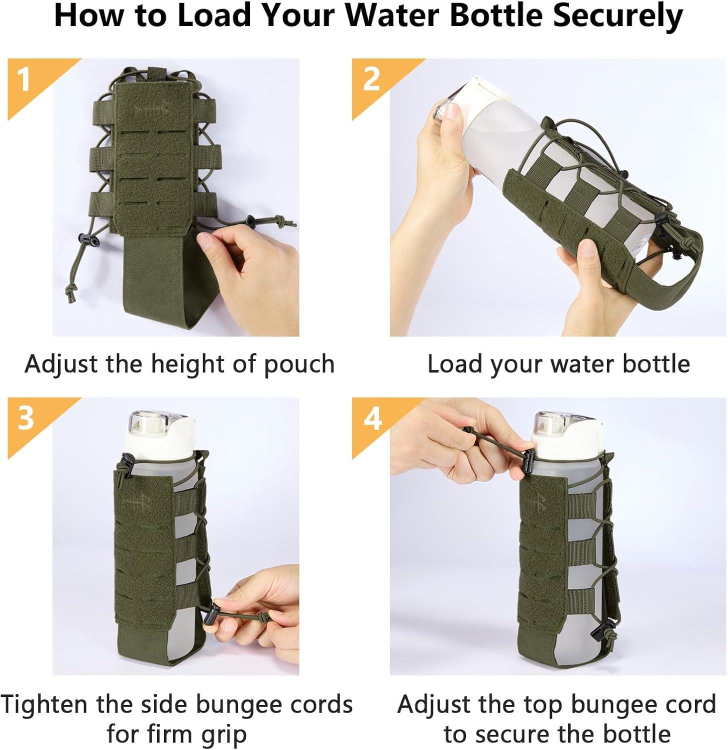 Secure & Customizable Design: 3 adjustable bungee cords, and dual MOLLE compatible straps keep bottles stable with no wobble; Detachable shoulder strap and carry handle design allows this pouch to be used independently; Front loop panel with laser-cut MOLLE slots allows patch customization and offers extra gear attachments