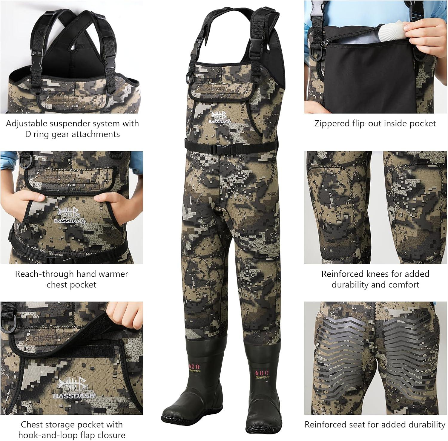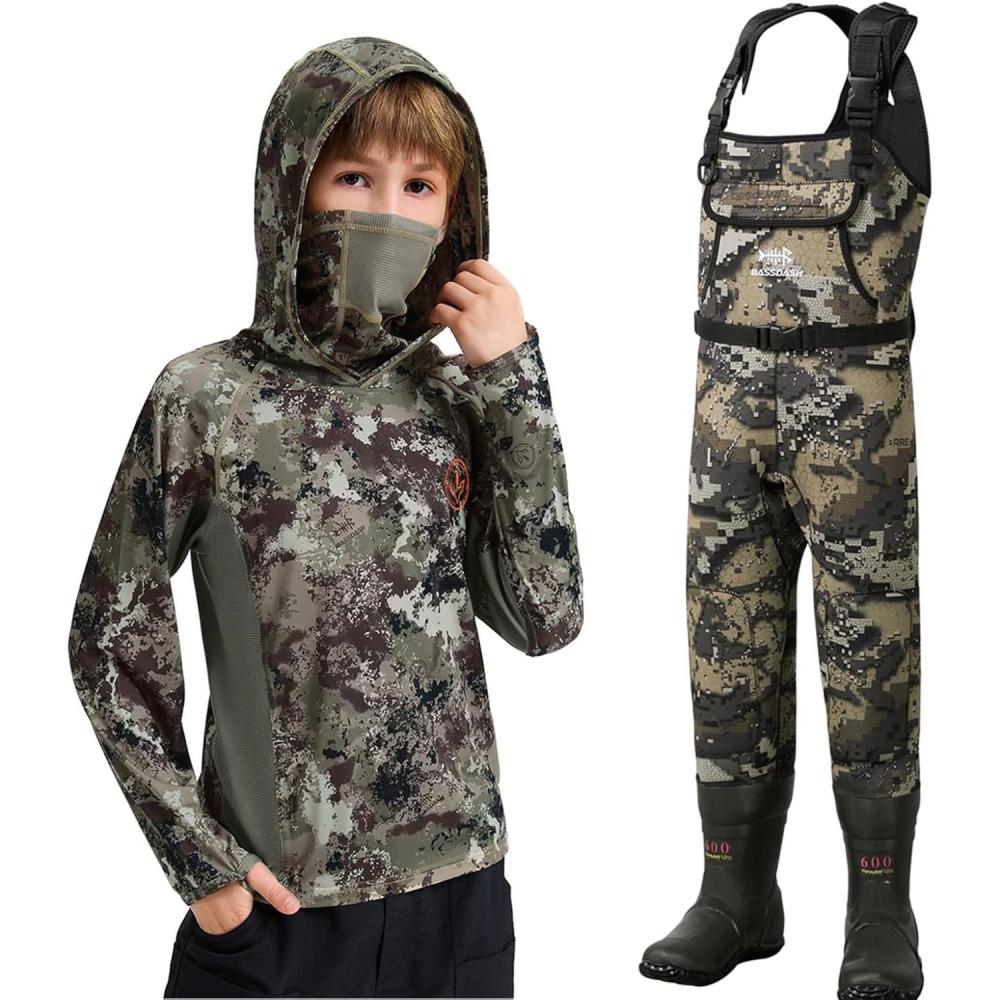 BASSDASH Youth & Kids Camo Hunting Fishing -Hunting Hoodies(M) & Chest Waders(6-7Y) Bundle