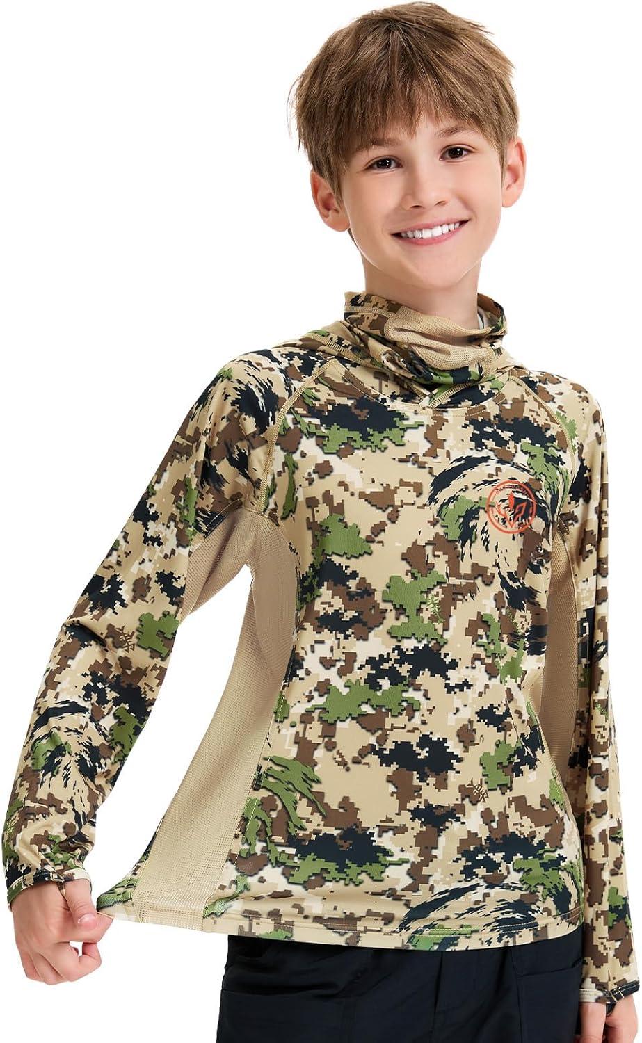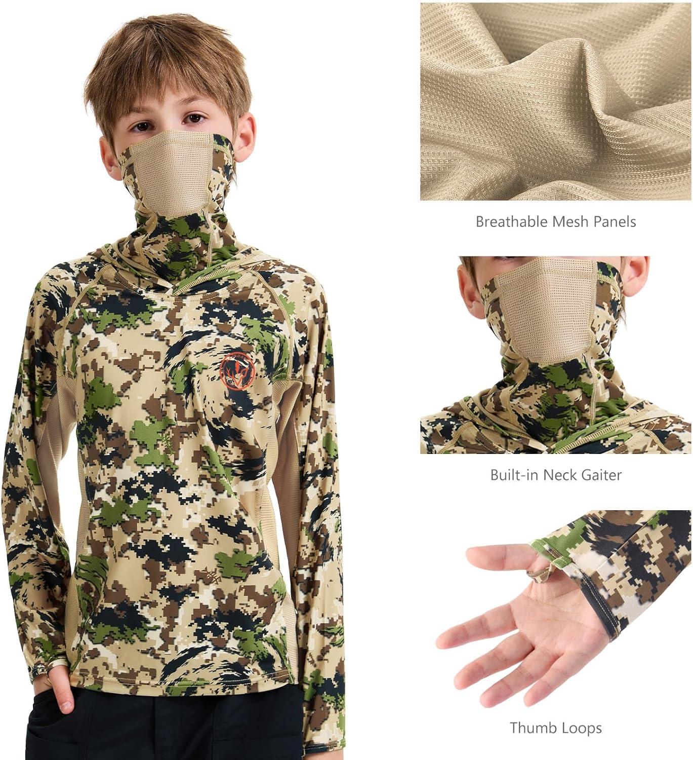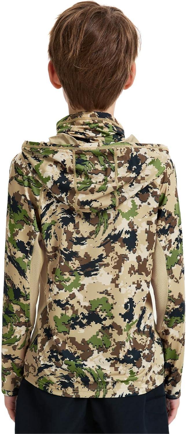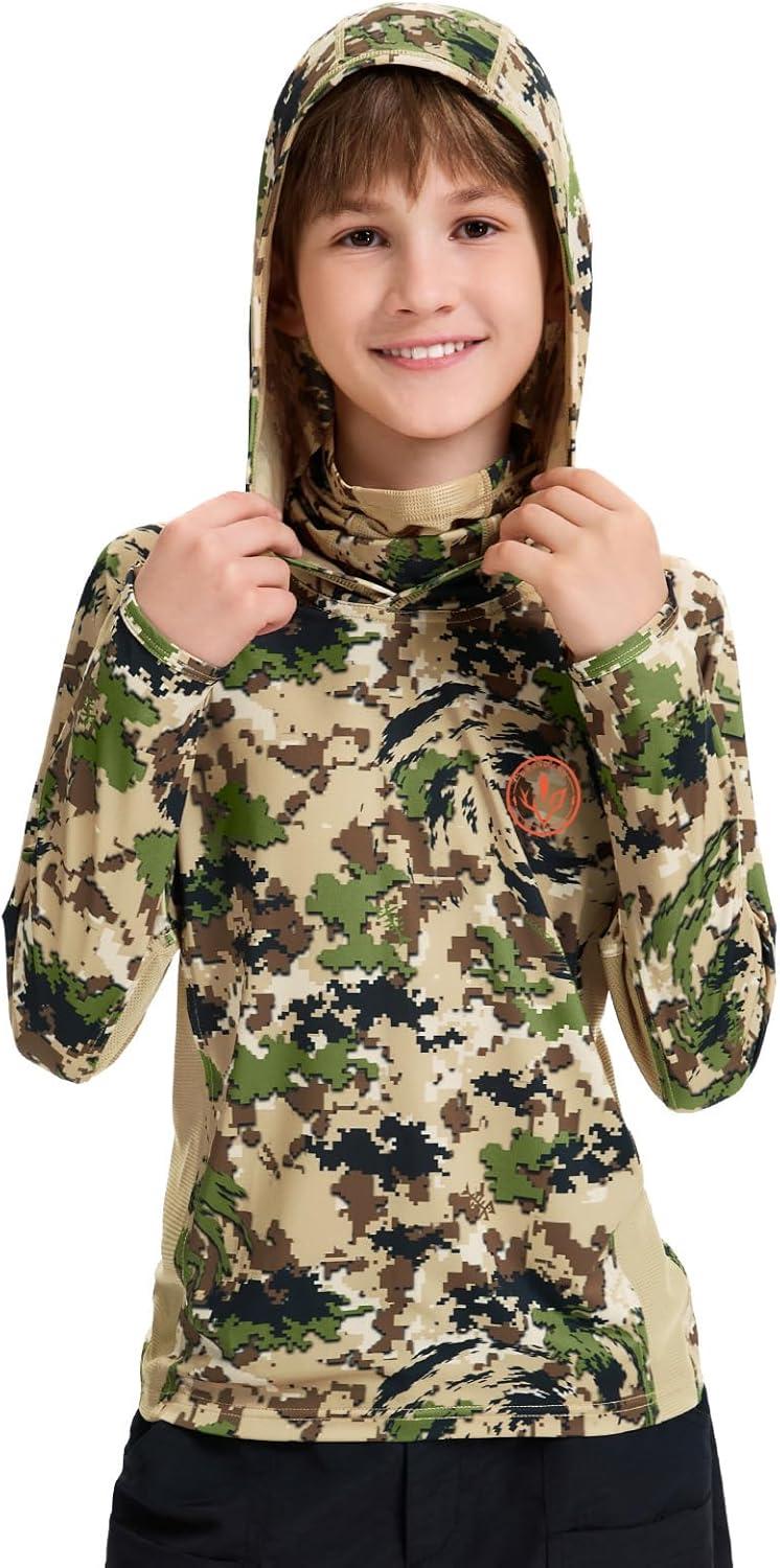 BASSDASH Youth UPF 50+ Camo Hunting Hoodie Shirt with Neck Gaiter Quick Dry Long Sleeve Hooded Tee for Fishing Hiking FS02Y(Moss Wood)